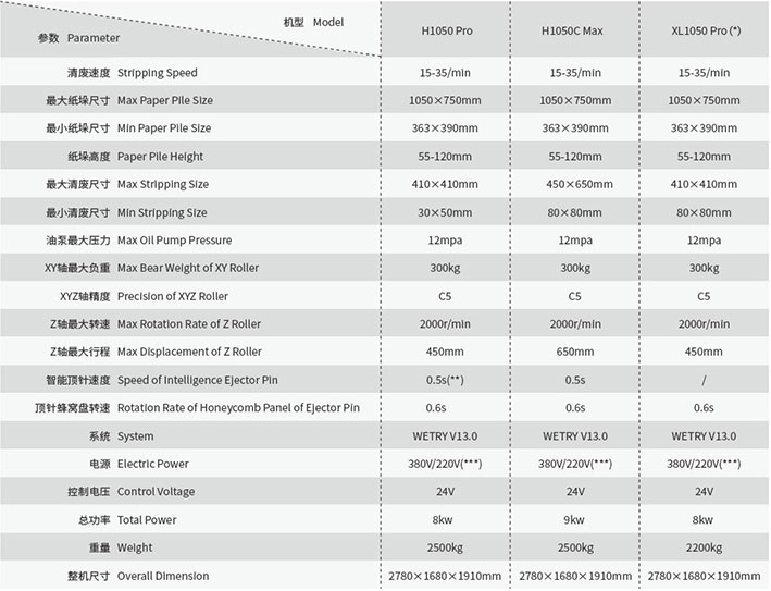 WETRY-H1050 Pro Type Intelligent Stripper adopts the exclusive technology that has Certification of Invention Patent of China. (ZL2015103048859 ZL2016102587813 ZL2016102587404). It is a professional equipment which can realize automatic stripping of any boxes with different sizes and shapes in one time by using single drive. Boxes with different sizes and shapes can be stripped in the same center of the single drive, which greatly reduces the transmission distance of X, Y, Z axis. It effectively improves the accuracy and stripping speed of the transformation of paper-pile. There are no requirements and restrictions on the products with shared blade sheet and loose core.