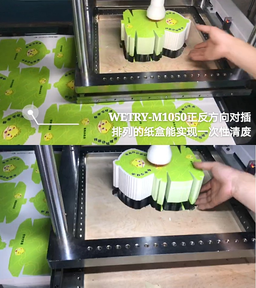 客戶(hù)問(wèn)10:我們的產(chǎn)品是紙杯正反方向拼版的, 筒切機(jī)模切,沒(méi)有咬口,兩邊都是弧形的紙邊,請(qǐng)問(wèn)這種可以用你們的設(shè)備清廢嗎?
