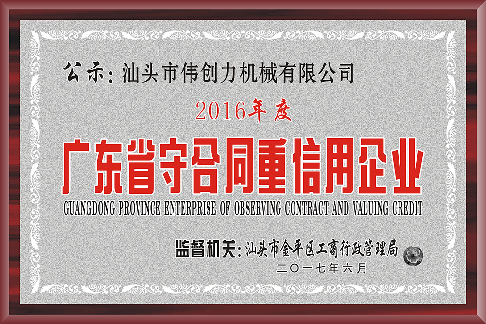 汕頭市偉創(chuàng)力機械有限公司獲得2016年度廣東省守合同重信用企業(yè)