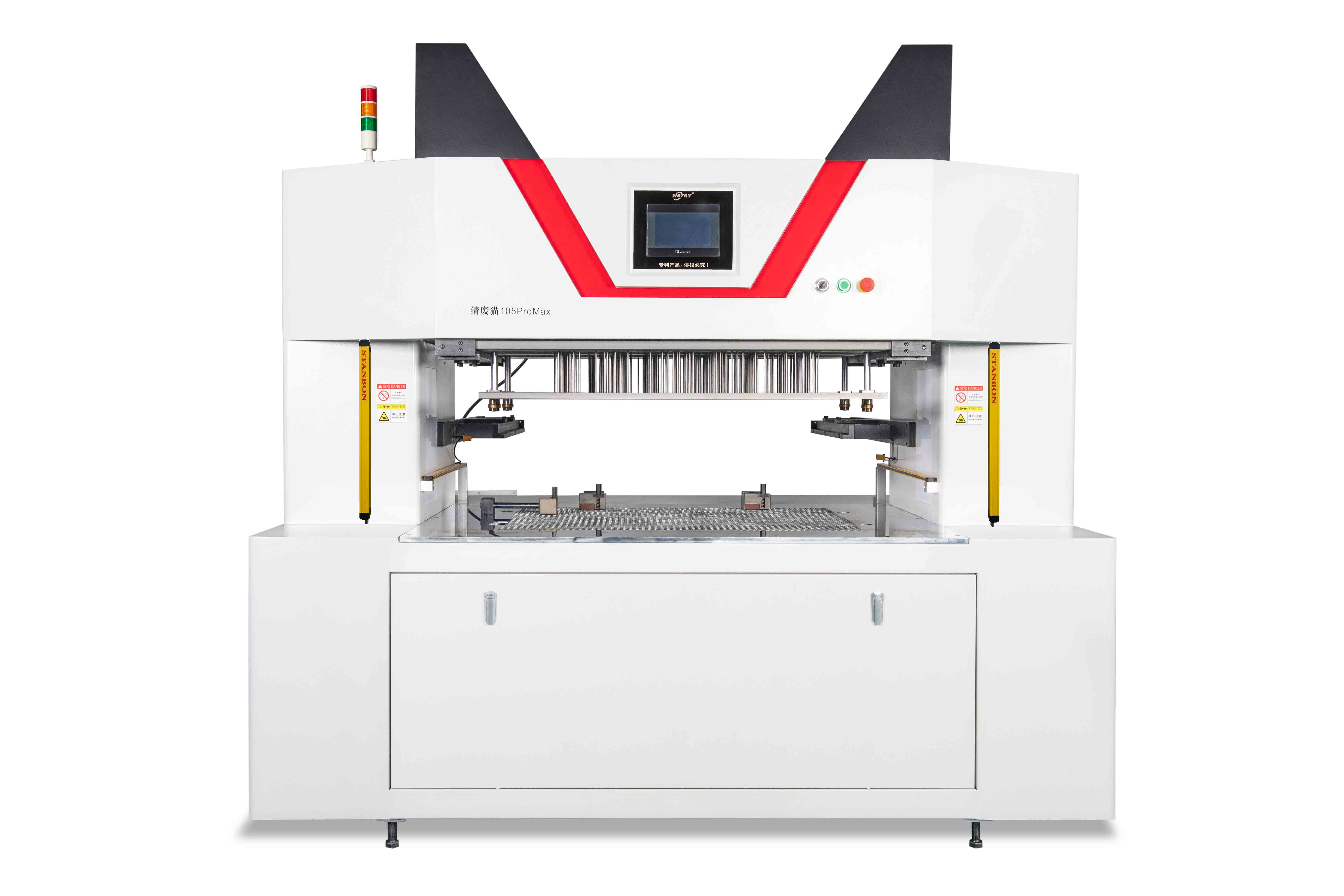 在清廢貓105Promax的基礎上,清廢貓105Ultra增加了上模移動,當上下模清廢工作完成后,上模自動往后退,方便取品工作,當扔掉廢料后上模自動回到原位等待下一次清廢。這種移動方式的好處在于不影響生產效率,相比下模移動可以提高三倍的清廢產量。